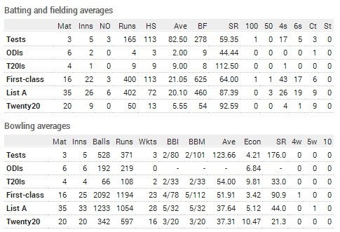 Of course he has a Test century and his batting average sits at a staggering 82.50. However, his FC average of 21.05 suggests that century is nothing short of a fluke.