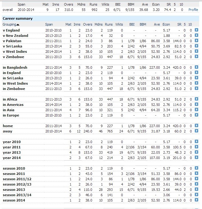 He’s only played two Test matches so far, but barring T20, he has a decent average in all formats of the game. Also, he always maintains a decent line and length with his bowling whenever he has been called upon. He was hugely impressive in the Asia Cup 2012 where he bowled a terrific line and length. But since the Asia Cup final, he has not been called upon to play an ODI, let alone a Test.